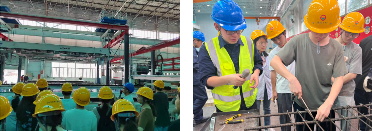 大家还参观了校企共建智能建造产教融合实训基地,在实训基地老师的指导下,动手实践了绑扎钢筋、链条长度调整、弯钩的安装等生产步骤,亲身体验了智能化制造业装配式构件的生产过程。
