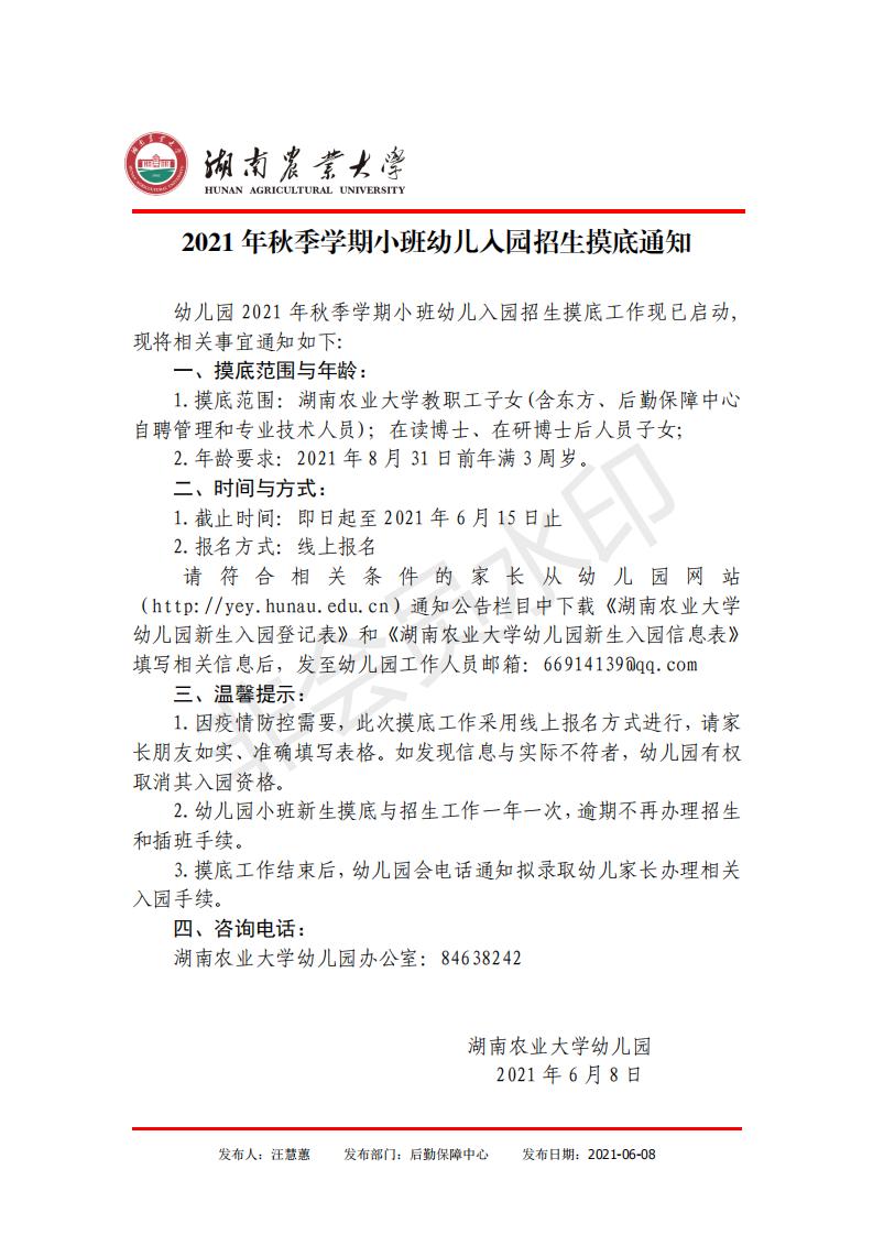 2021年秋季学期小班幼儿入园招生摸底通知