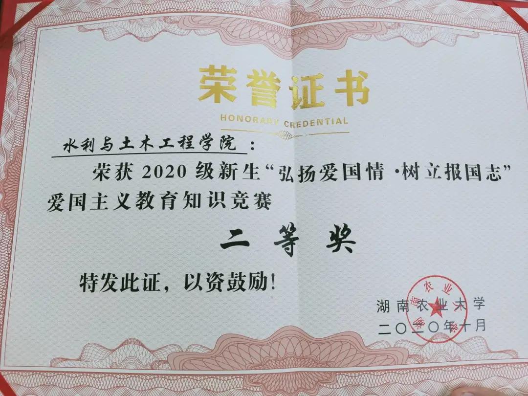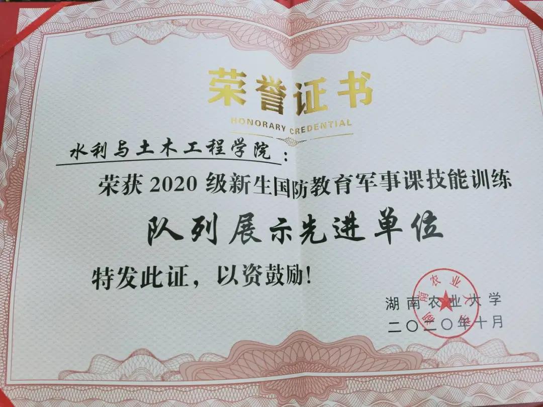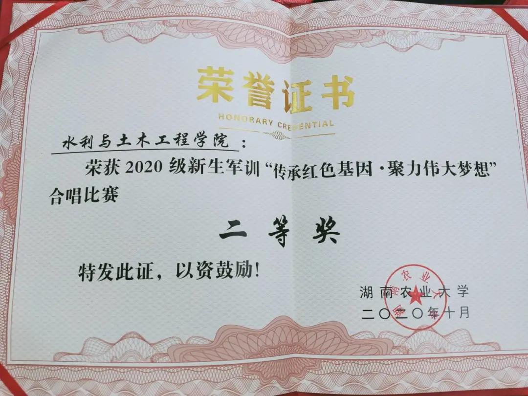伴随着《国家2020》的歌声,各方阵集体入场,一起挥动着手中红旗,合唱这首歌曲。入场完毕后,全体成员摆出“中国梦 、 国家富强、 民族振兴 、人民幸福”字样,点燃了大会的高潮。最后,2020级新生军训在校歌声中结束了。我院取得了“队列展示先进单位”、爱国主义教育知识竞赛二等奖和合唱比赛二等奖等多项荣誉。