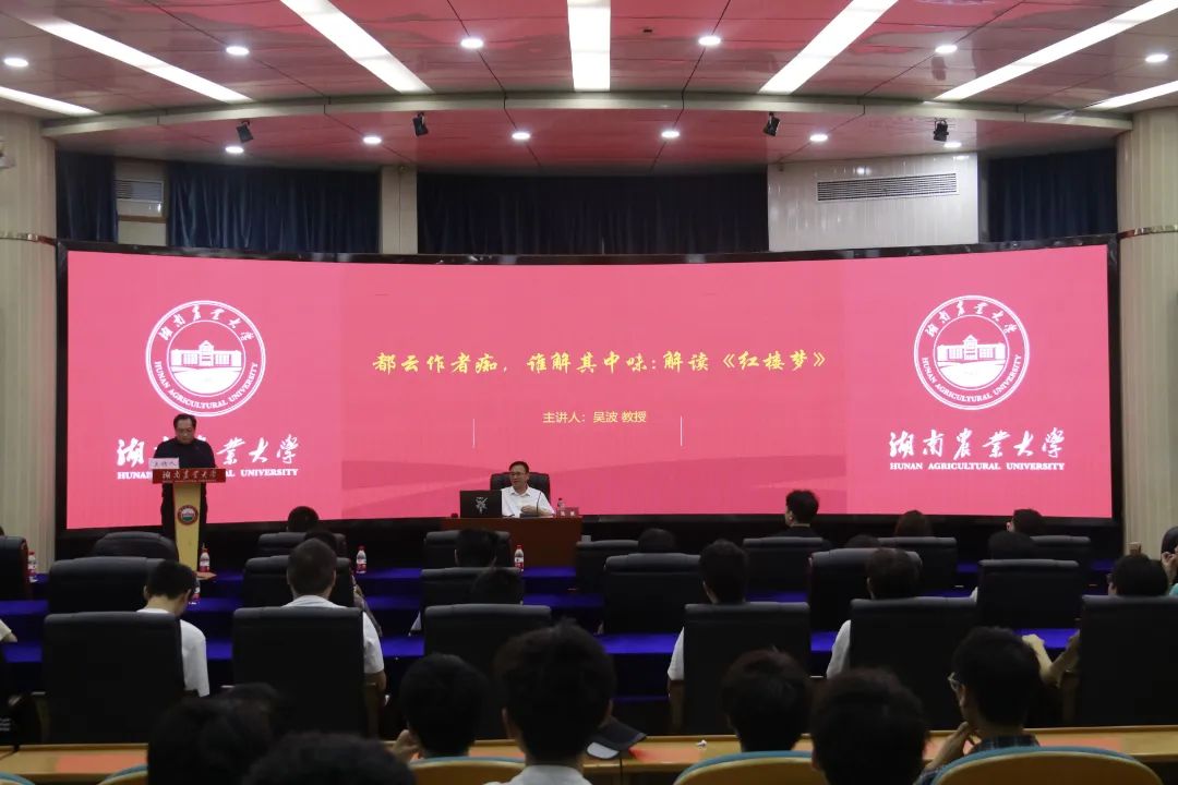 习近平总书记指出“中华优秀传统文化是中华民族的精神命脉,是涵养社会主义核心价值观的重要源泉,也是我们在世界文化激荡中站稳脚跟的坚实根基。”6月13日晚上,湖南农业大学党委委员、副校长吴波教授在国际交流中心以“都云作者痴迷,谁解其中味”为题分享了古典文学名著《红楼梦》。学院领导班子成员、师生代表出席本次活动,学院党委书记丁凯主持。