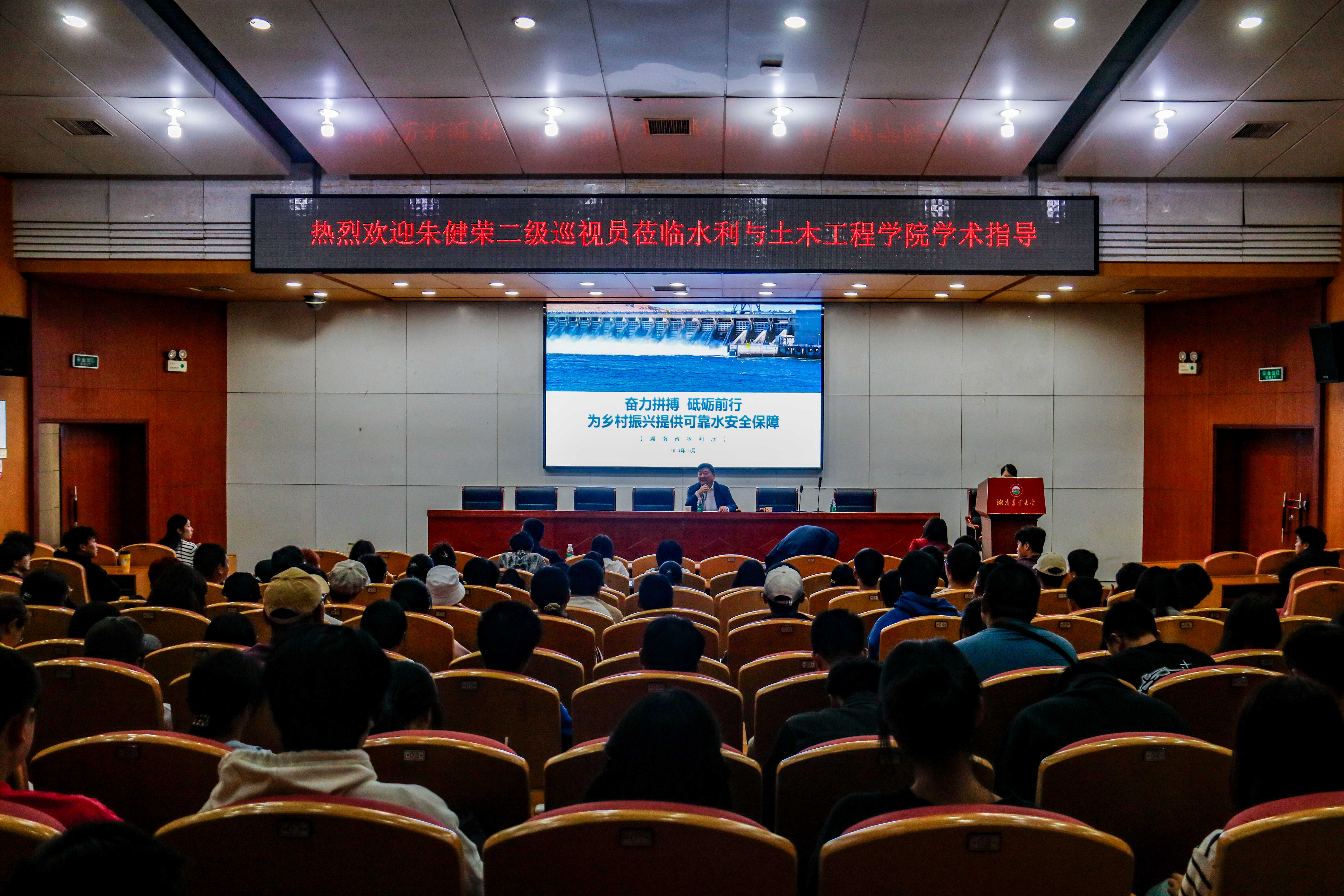朱健荣以“奋力拼搏 砥砺前行——为乡村振兴提供可靠水安全保障”为题,结合个人科研工作经历,分享了在科研探索道路上的心得感悟。他指出“科学成就离不开精神支撑”,从致力于科学救国的艰辛历程,到迈向科技强国的辉煌征程,科学家精神始终是不可或缺的核心力量,爱国是科学家精神的底色,要面向国家重大需求做纯粹科研人。科技工作者要将个人的学术追求与国家的发展战略、人民福祉紧密相连,时刻关注国家在科技、经济、社会等领域的战略需求,通过创新突破,引领科技前沿,提升国家科技竞争力,为加快建设科技强国、实现高水平科技自立自强贡献力量。同时,他还分享了乡村振兴背景下水利学科如何更好地服务于社会。他指出,水利学科的研究不仅要追求科学性,还要注重实用性和创新性,以满足社会发展的需求。他鼓励同学们在学习和研究中,要注重理论与实践的结合,以实际行动推动乡村振兴。