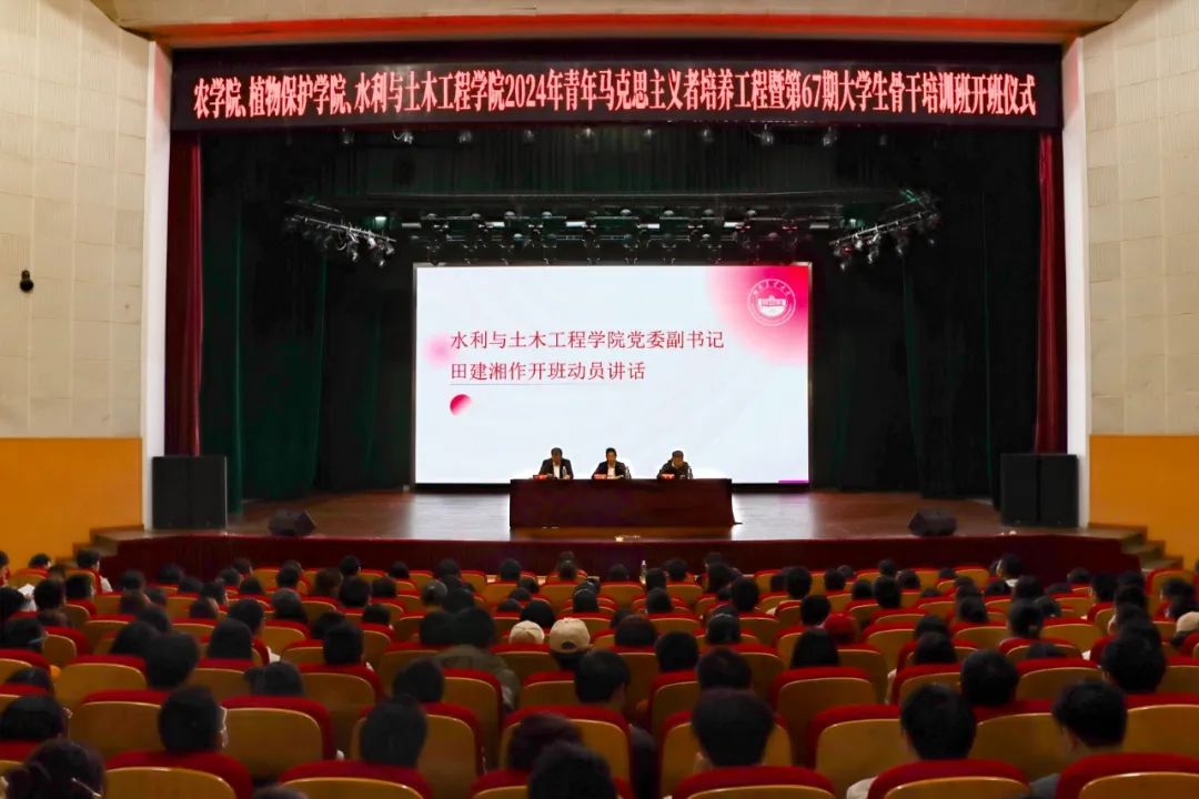 11月17日,91av视频、农学院、植物保护学院联合举办的2024年青年马克思主义者培养工程暨第67期大学生骨干培训班开班仪式在大礼堂隆重举行。水利与土木工程党委副书记田建湘,农学院党委副书记徐辉,植物保护学院党委副书记余展,三个学院团委书记、辅导员老师出席本次培训的开班仪式。三个学院的院级团委学生会新一届成员代表、2024级各团支部委员会、班委会成员代表共计460名学生骨干参加本次培训。会议由农学院党委副书记徐辉主持。