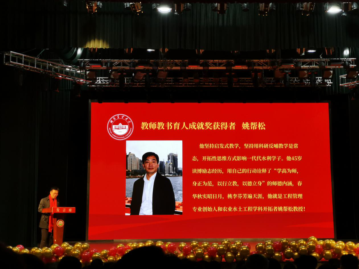 在捐赠仪式上,1999级水利校友为裴毅、姚帮松两位退休教师颁发了教师教学育人成就奖,2002水利校友为姚琦等3位学生颁发了校友奖学金,2001级水利校友为学院建设和发展捐赠了10万元人民币。